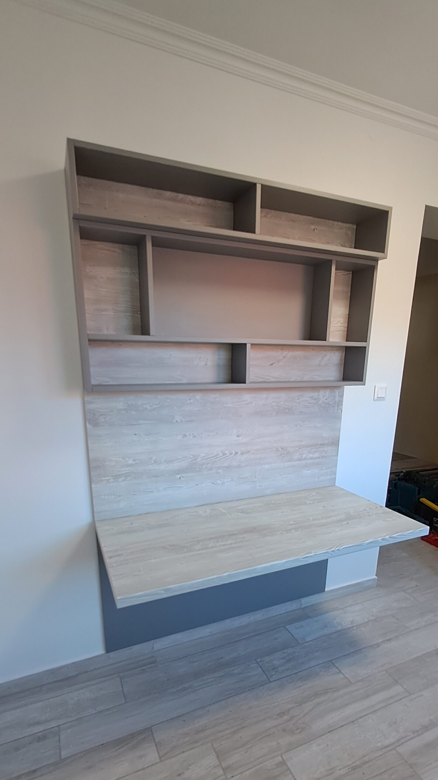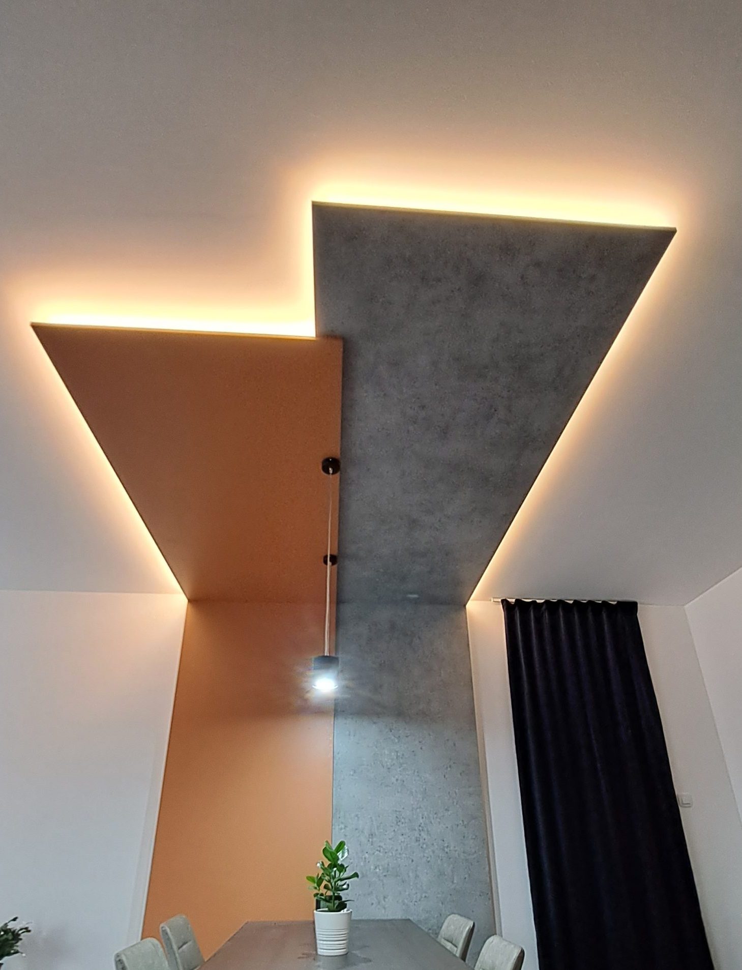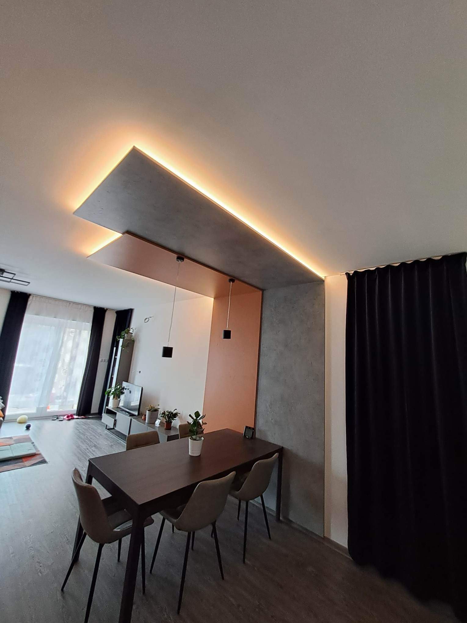 Amit a megrendelő egyszer megálmodott, abban segítünk, hogy ne csak álom maradjon. Egyedi elemekkel, színkombinációval és rejtett LED világítással alkottuk meg az egész nappalit meghatározó falburkolatot.